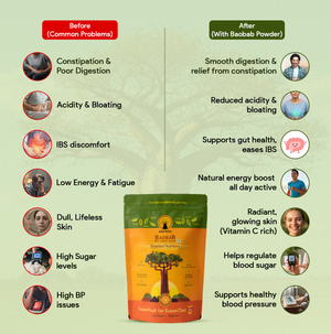 Just wanted to come here and thank you guys for doing such an amazing work. My mom is 66, diabetic and is on blood thinners. And as a result of all these her gut health was really compromised. She used to struggle with bloating and constipation and I really wanted her to get off her antacid tablets and try something natural, with lots of research i got to know about the superfood baobab and then saw that you guys are selling it. And trust me writing this review in 15 days of usage , my mom has gotten rid of her antacids and does not suffer from bloating and constipation anymore. Thank you for choosing to heal through food.